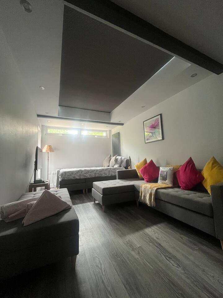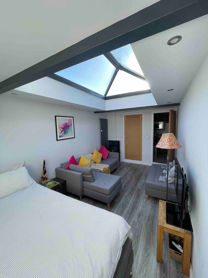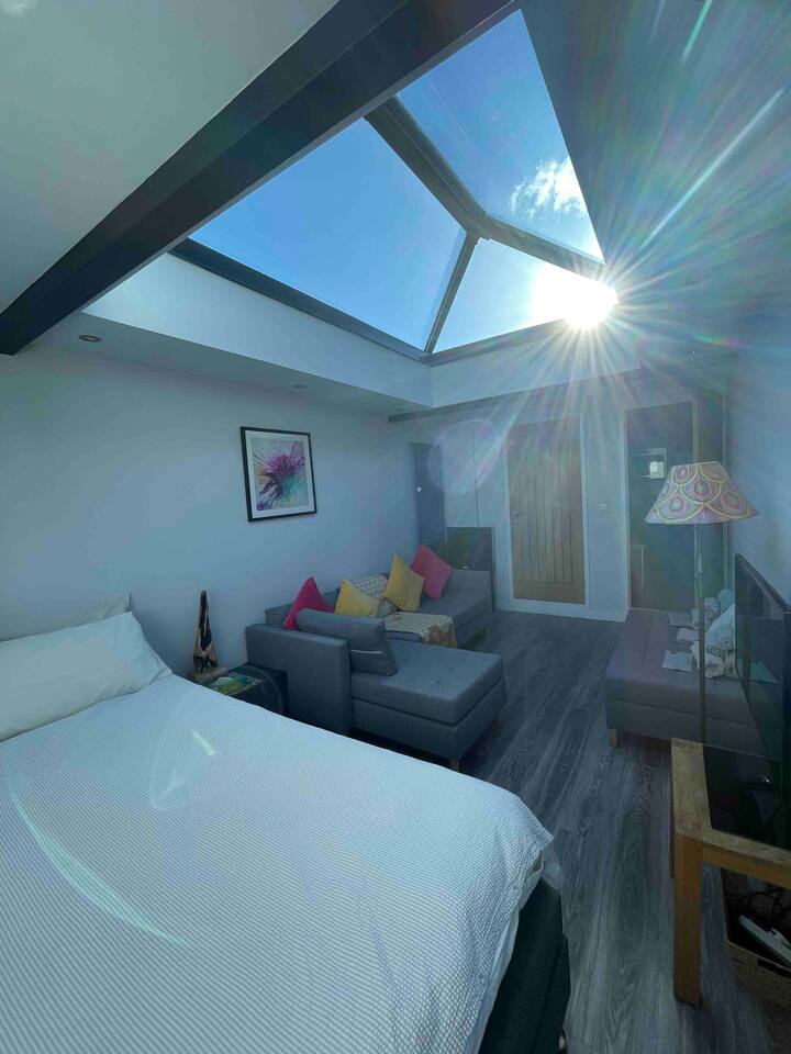 Domed glass roof provides floods of natural light and a view of the stars during the night. With full automatic remote controlled window blinds to ensure darkness and a good nights sleep. It’s very private , insulated and totally self contained to provide a true getaway. The front garden comes with patio set and outdoor seating to enjoy in the summer months. The combined bedroom and lounge comes with full double bed with high quality mattress and large corner sofa with chaise longue and flatscreen TV with amazon fire stick for Netflix. The kitchen is fully equipped with electric hob, eyeline microwave oven, small fridge and dishwasher as well as belfast sink The stylish bathroom has a large luxurious rainfall shower and mirror light and sink - all towels, shower products and everything you need for a comfortable stay will be provided. A welcome pack containing wine and snacks will be provided along with a parking permit to allow you to park on our quiet street with plenty of parking space.